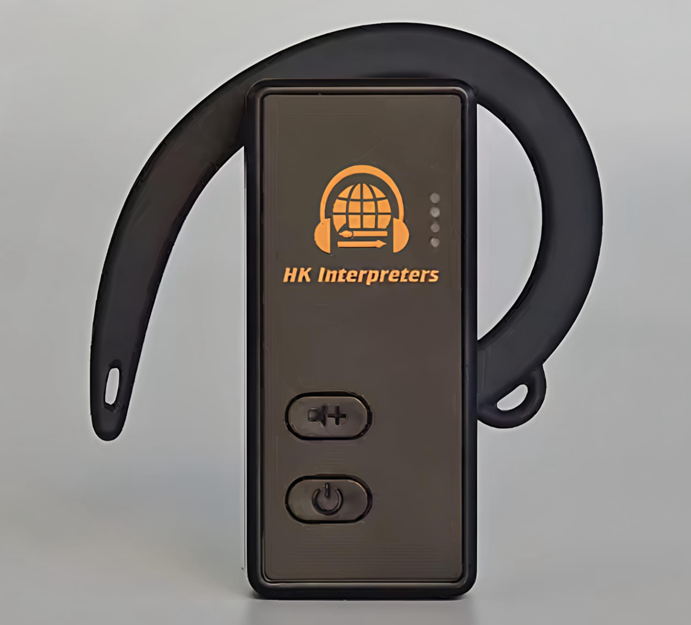 接收器:與會者手持的小型設備,上面有頻道選擇鈕,可選擇要收聽的語言(例如:頻道1-中文,頻道2-英文)。